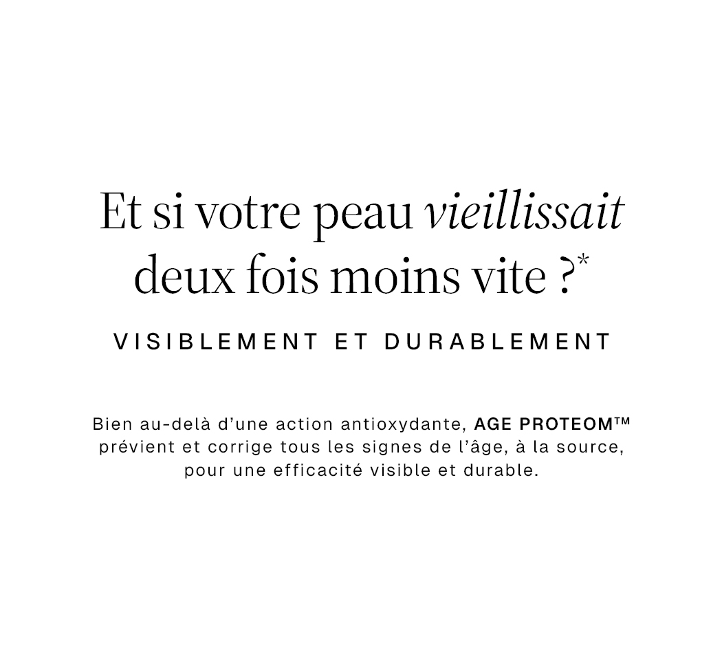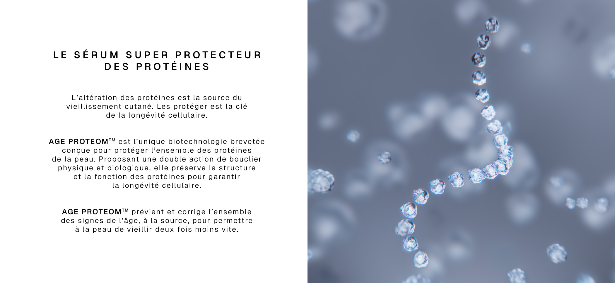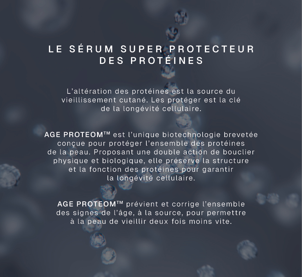 Formulé à partir d’un microorganisme quasi-immortel, capable de résister aux conditions les plus extrêmes, AGE PROTEOM™ Advanced Serum protège et renforce la totalité des protéines de la peau : le protéome, garant de la longévité cellulaire. En retrouvant son fonctionnement optimal, le pouvoir d’auto-réparation de la peau est renforcé et les mécanismes naturels de lutte contre les rides et l'ensemble des signes de l’âge sont restaurés.