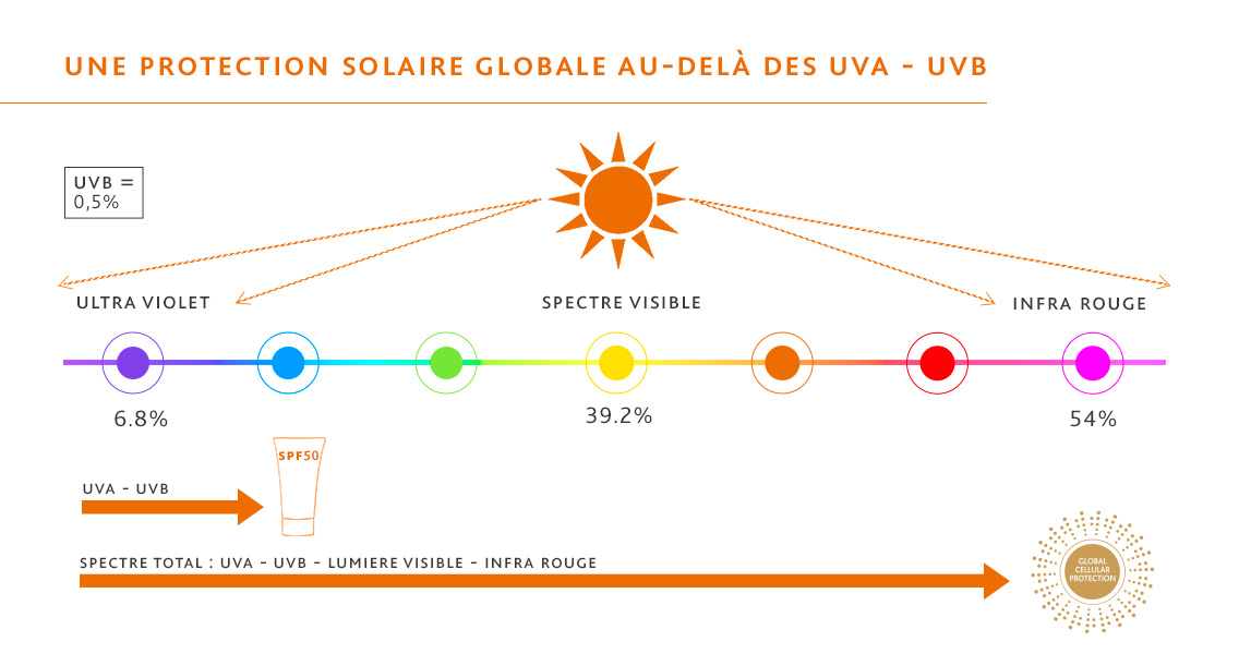 Le spectre solaire se compose à 90 % d’infrarouges et de lumière visible et à 10 % d’UVA et UVB. Pendant longtemps, la protection solaire s’est concentrée sur les UVB principalement.