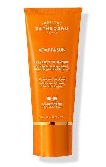 La Crème de soin protectrice visage ADAPTASUN Soleil modéré apporte à la peau ce dont elle a besoin pour rester protégée, parfaitement hydratée et éclatante de jeunesse, tout en optimisant un bronzage rapide, durable et lumineux.